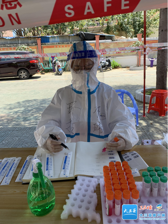 今年32歲的謝學慧是三亞環(huán)投集團的一名工作人員。在集團工作群中收到號召黨員干部職工下沉一線,踴躍參與疫情防控志愿服務的消息后,謝學慧第一時間報了名。4月2日至今,每天早晨五六點開始,謝學慧一直在核酸檢測點位連軸轉,揮灑著青春的汗水。