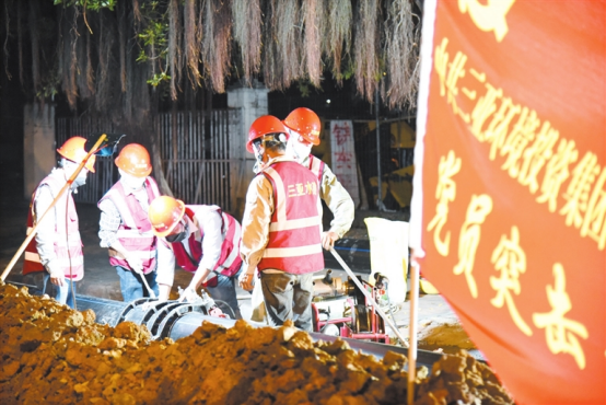 為充分發(fā)揮黨支部的戰(zhàn)斗堡壘和覺(jué)員的先鋒模范作用,三亞環(huán)投集團(tuán)覺(jué)委在方艙醫(yī)院建設(shè)工地成立臨時(shí)黨支部,把黨旗插在項(xiàng)目建設(shè)最前線。4月4日 下午2點(diǎn)正式開(kāi)工后 ,領(lǐng)導(dǎo)干部身先士卒,坐鎮(zhèn)一線指揮,臨時(shí)黨支部28名覺(jué)員挺在前面,由170人組成的建設(shè)隊(duì)伍不畏艱險(xiǎn)、不分晝夜,在五個(gè)作業(yè)面同時(shí)并聯(lián)施工,50臺(tái)作業(yè)設(shè)備不間斷運(yùn)轉(zhuǎn),經(jīng)過(guò)連續(xù)90小時(shí)的晝夜奮戰(zhàn),三亞方艙醫(yī)院供排水保障工程于4月8日上午8時(shí)實(shí)現(xiàn)通水 ,提前三天完成交辦任務(wù),為整個(gè)項(xiàng)目按時(shí)完工、交付使用貢獻(xiàn)了環(huán)投力量。