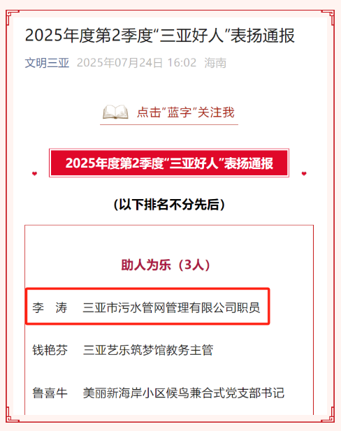 近日,中共三亞市委精神文明建設(shè)和愛國衛(wèi)生運動委員會辦公室發(fā)布《2025年度第2季度“三亞好人”表揚通報》,三亞環(huán)農(nóng)集團(tuán)旗下三亞市污水管網(wǎng)管理有限公司職員李濤榮獲“三亞好人”稱號。