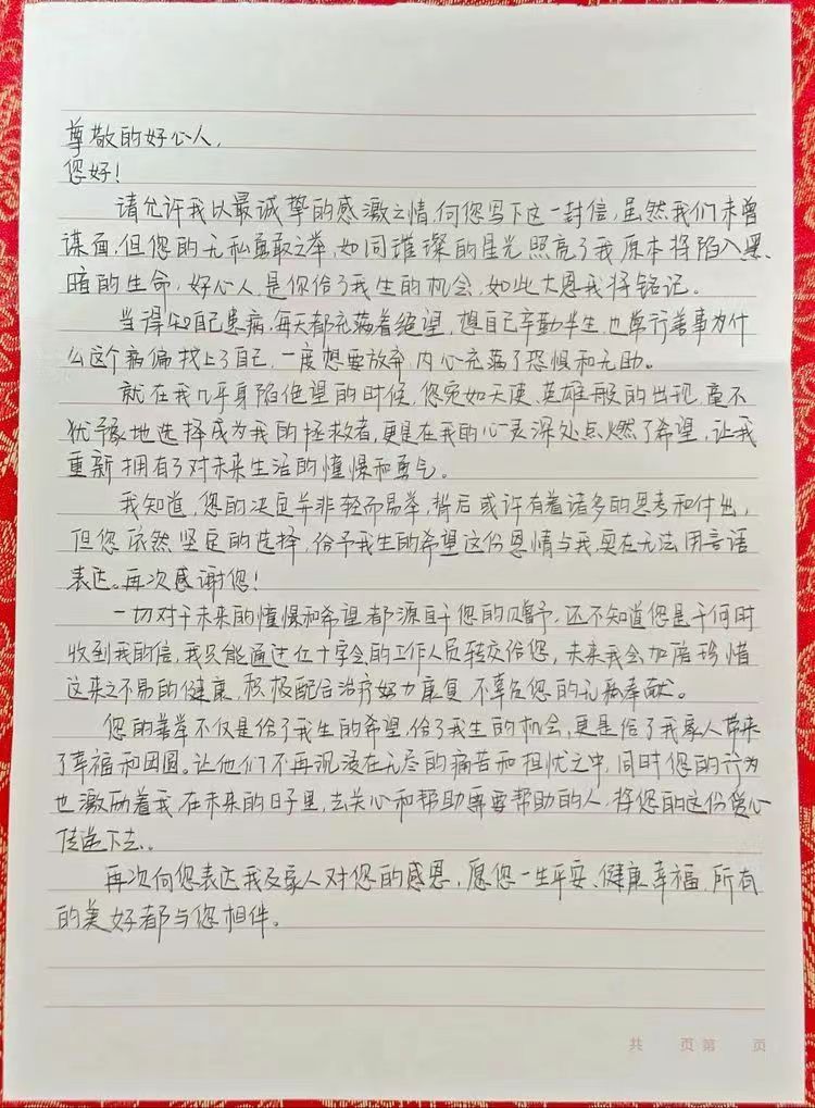 7月17日,經(jīng)過數(shù)小時采集,這份“生命的種子”成功輸送到患者體內(nèi),為對方帶去重生的希望。該患者在感謝信中對李濤說:“未來我會加倍珍惜這來之不易的健康,積極配合治療努力康復(fù),不辜負(fù)您的無私奉獻(xiàn)……您的行為也激勵著我,在未來的日子里,去關(guān)心和幫助需要幫助的人,將您的這份愛心傳遞下去。”